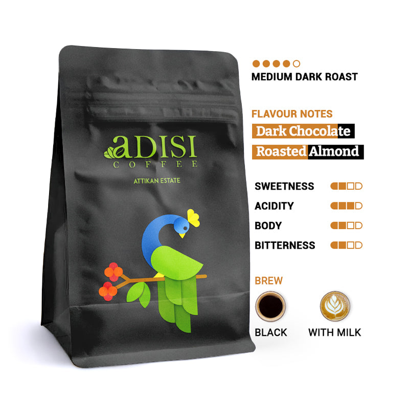 Dark chocolate & roasted almond notes from Attikan Estate.