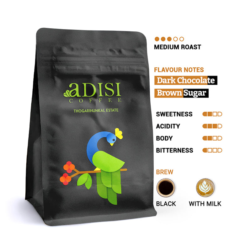 Dark chocolate & brown sugar notes from Thogarihunkal Estate.